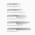 - Set includes 3.5" (9 cm) paring knife, 4.5" (11 cm) serrated knife, 5.5" (14 cm) santoku knife, 8" (20 cm) chef's knife and 8" (20 cm) bread knife