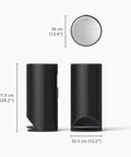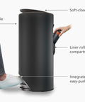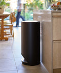 This stylish circular bin has a large pedal that fits neatly within the footprint of the design, saving valuable floor space. Additionally, it features an integrated storage compartment at the back for liners, making them easy to access when needed. Finished in stylish carbon-black steel, it has a capacity of 30L (7.9 US Gallons).