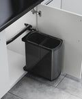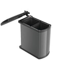 Featuring an automatic tilt-and-turn lid mechanism, the bin opens smoothly as the cabinet door is pulled out, keeping waste covered when not in use. The steel housing, finished in a dark grey powder coating, is both durable and easy to clean, while the robust black plastic inner components ensure long-lasting performance. Whether mounted on the left or right cabinet wall, the Hailo Duo maximises your under-bench space without compromising functionality.