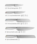 - Set includes 3.5" (9 cm) paring knife, 4.5" (11 cm) serrated knife, 5.5" (14 cm) santoku knife, 8" (20 cm) chef's knife and 8" (20 cm) bread knife