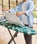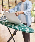 This green ironing board offers a fast and simple setup, with seven adjustable height settings. When not in use, the board folds down for compact storage.