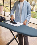 This compact ironing board comes with an advanced, multi-layer cover with DripShield™ Technology that's been designed to cope with large volumes of ironing or for use with steam generator irons. An extra-large steam iron rest can be retracted when stored.