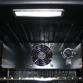 Black Tropical rated glass door mini bar fridge, very well built unit with internal fan, chromed shelves, reversible door with lock and brilliant finish. Very stable temperature and plenty of shelf adjustments utilizing 1 x full sized and 1 x half sized shelf.