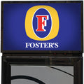 Upright 160 litre Fosters Beer branded skinny glass door bar fridge with plenty of shelf adjustments, triple glazed LOW E glass, lock and brand name parts.