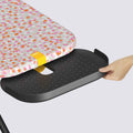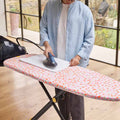 This ironing board offers a fast and simple setup, with five adjustable height settings and an extra-large, retractable steam iron rest. When not in use, the board folds down slimly for compact storage.