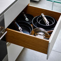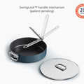 - Select pans come with tempered glass lids with folding stainless-steel handles.